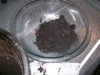 Twist the Oreos apart, leaving the cream on the cookies. Put into food processor and grind until they become fine crumbs. You do not want any large pieces. (Surprisingly, the crumbs will be dry even with the cream.)